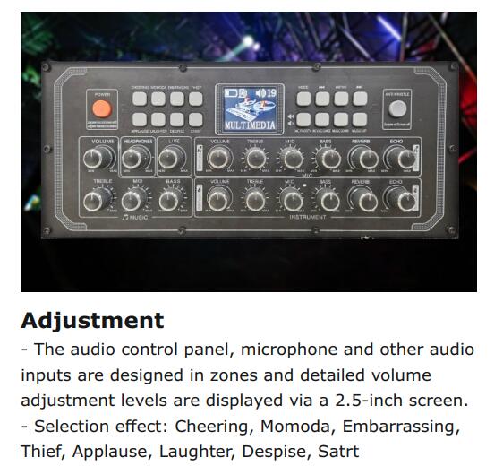 The audio control panel, microphone and other audio inputs are designed in zones and detailed volume adjustment levels are displayed via a 2.5-inch screen. - Selection effect: Cheering, Momoda, Embarrassing, Thief, Applause, Laughter, Despise, Start. It's easy and convenient to use, and our customers love it.